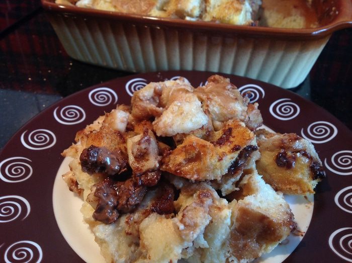 Блюдо с пудингом поставьте в большую форму с горячей водой. Выпекайте, в предварительно разогретой до 160 градусов духовке, в течении 1,5 часов.