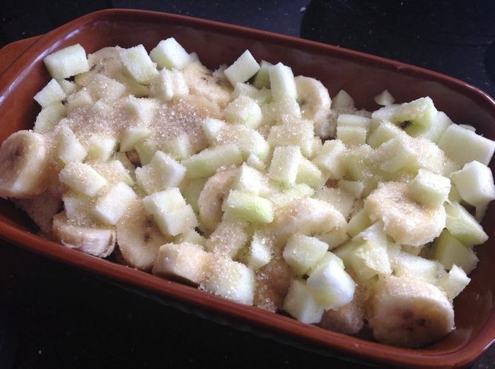 Распределите половину хлебных кубиков по дну огнеупорной формы. Сверху выложите яблоки и бананы.