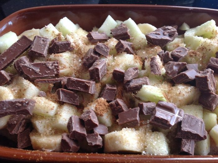 Посыпьте корицей, половиной сахара и половиной поломанного шоколада.