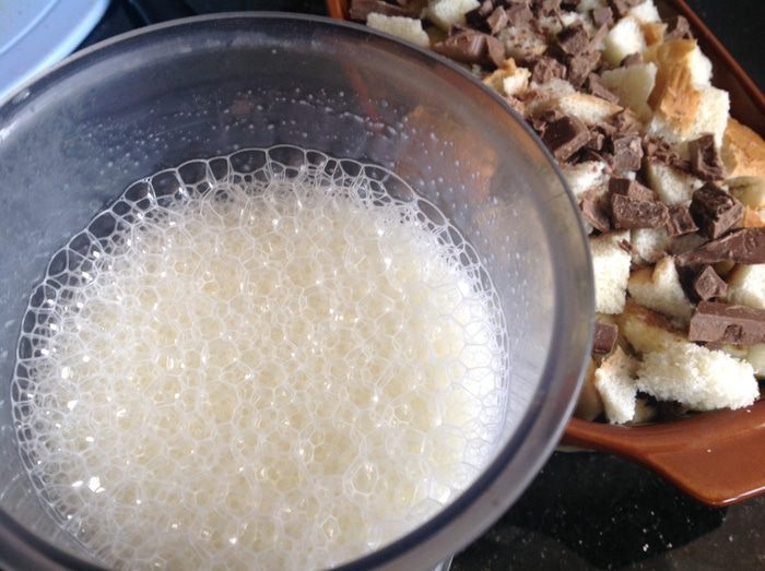 Яйца, молоко, ванилин и оставшийся сахар взбейте блендером. Аккуратно полейте смесью пудинг, дайте настояться 15 минут.