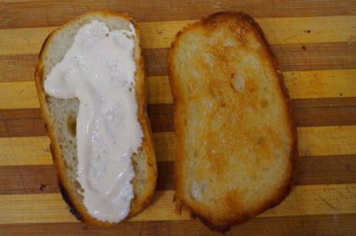Наносим майонез на гренку со стороны не намазанной чесноком.