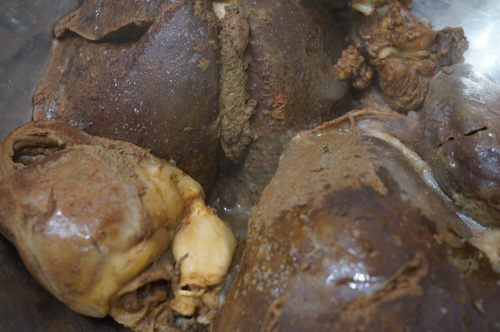 Варим до готовности (около часа) в подсоленной воде. В конце варки добавить зелень: сухую петрушку и мяту. Готовый ливер (сердце, печень, легкие) нарезаем тонкими кусочками.