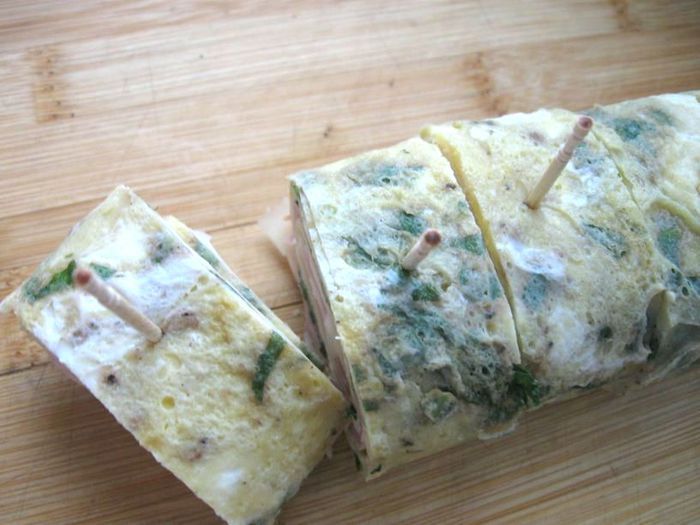 Скрутить омлет с начинкой рулетом.