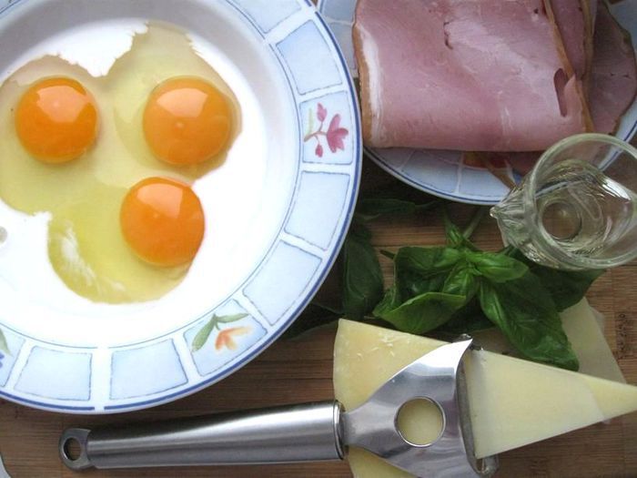 Помыть, обсушить базилик. Мелко порезать 1 веточку базилика. Сыр тонко порезать лепестками с помощью овощечистки. Перемешать яичную смесь.