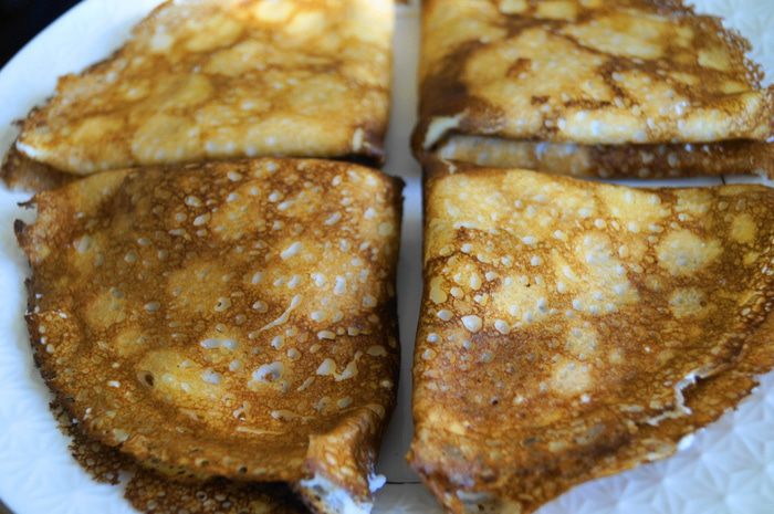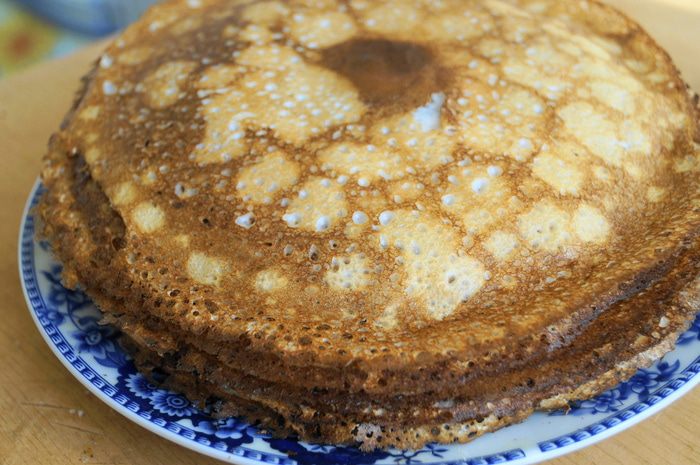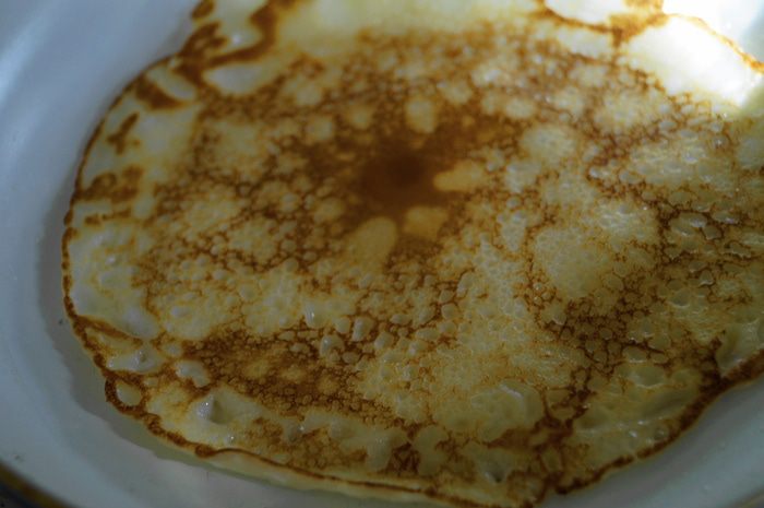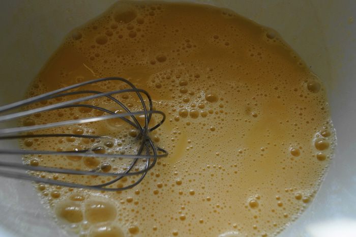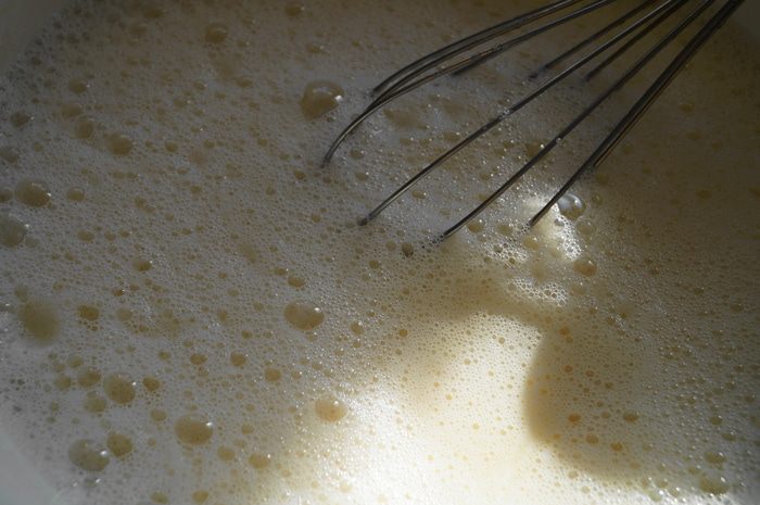 Для блинов: Взбить яйца в пышную пену с солью и сахаром.