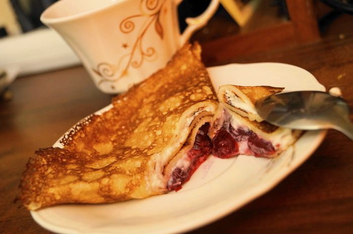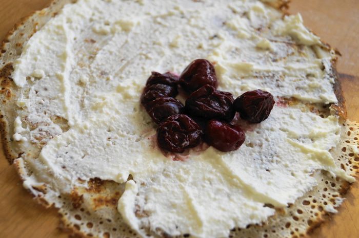 Блин намазать небольшим слоем творожной массы и положить несколько вишен.