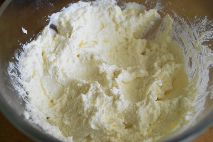 Начинка: творог хорошенько растереть с сахаром, сметаной и ванилином.