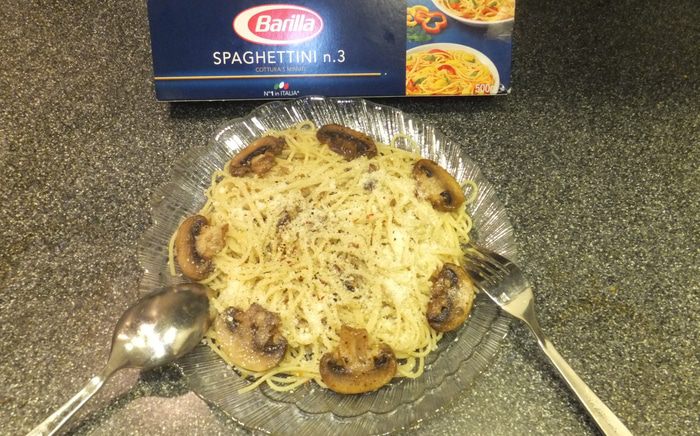 Грибы, морковь и луковицу порежьте и обжарьте на оливковом масле. Добавьте 100 мл воды, в которой варились спагетти, специи и доведите до кипения.