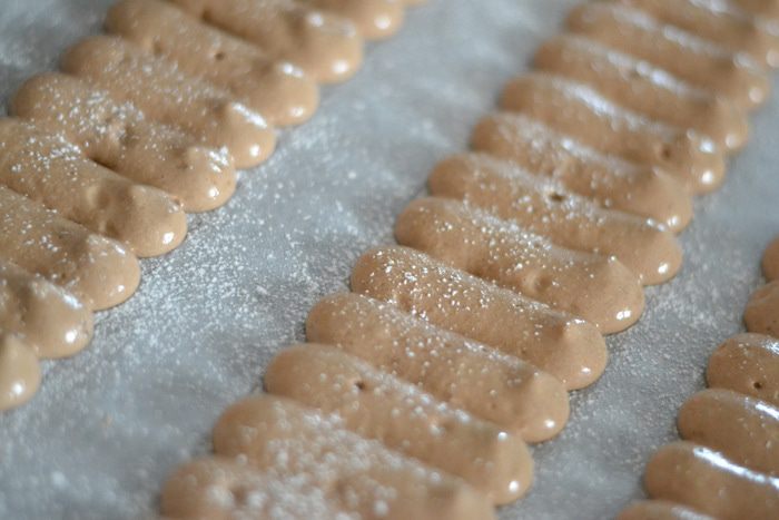 Меряем сантиметром размер нашей формы,ширину и длину,сделать это нужно до приготовления печенья , чертим карандашом на пергаменте нужные нам полоски,выдавливаем из кондитерского мешка небольшие палочки близко к друг другу,посыпаем обильно сахарной пудрой и выпекаем около 10 минут до готовности.