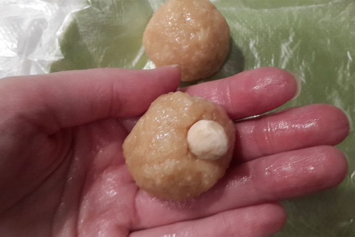 Когда масса остынет и станет еле теплой, она застынет и можно лепить шарики, величиной чуть больше грецкого ореха. В каждый положить миндаль. Выложить на тарелку, устланную пленкой и поставить в холодильник до полного застывания (от 20- 30 минут).
