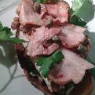 Гренки, приготовленные из свежего батона с нанесением на них густого соуса, покрытые затем сочным куриным филе и тонким хрустящим беконом, украшенные веточкой петрушки.
