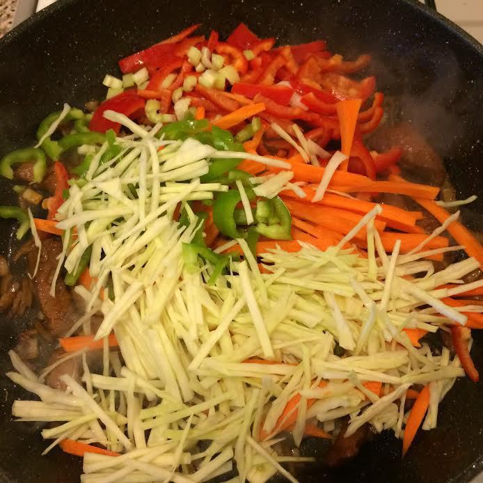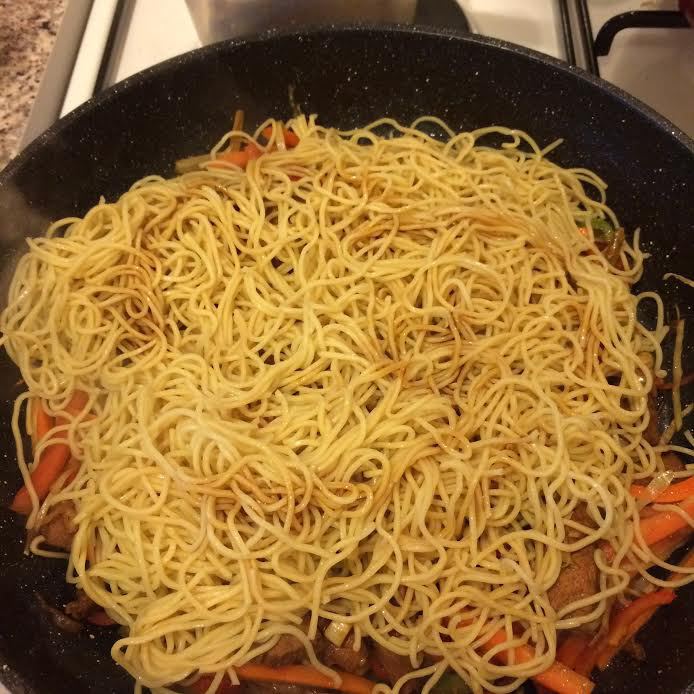 Затем добавить лапшу, 1 ст. л. соевого соуса, перемешать, тушить 1 — 2 минутки и снять с огня.