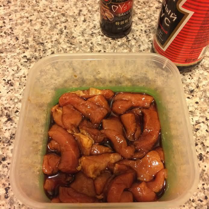 Положить в миску, добавить соевый соус, устричный соус, перемешать, закрыть крышкой и отправить в холодильник на ночь.