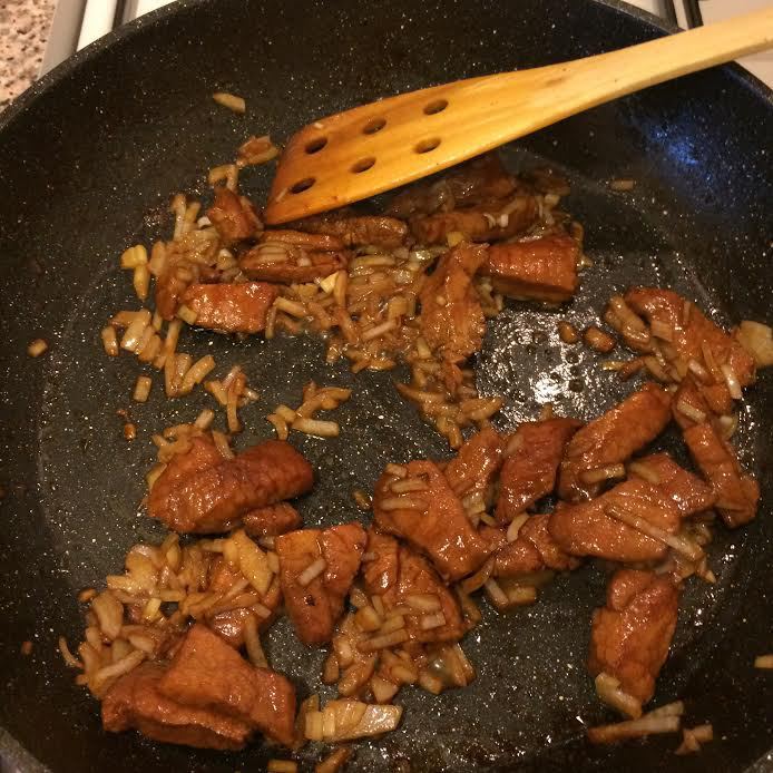 Разогреть сковороду (вок) добавить масло, обжарить мясо на сильном огне до румяной корочки.