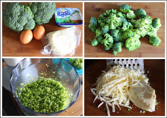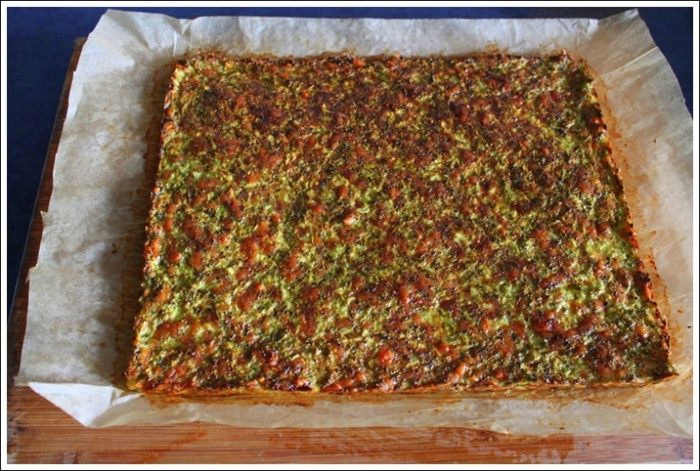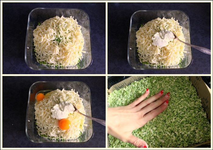 Смешиваем брокколи с сыром. Добавляем творог (для этого рецепта лучше брать кремовый творог). Вбиваем яйца и хорошенько перемешиваем. Распределяем в форме застеленной пекарской бумагой. Хорошо прихлопываем ладошкой для равномерности.