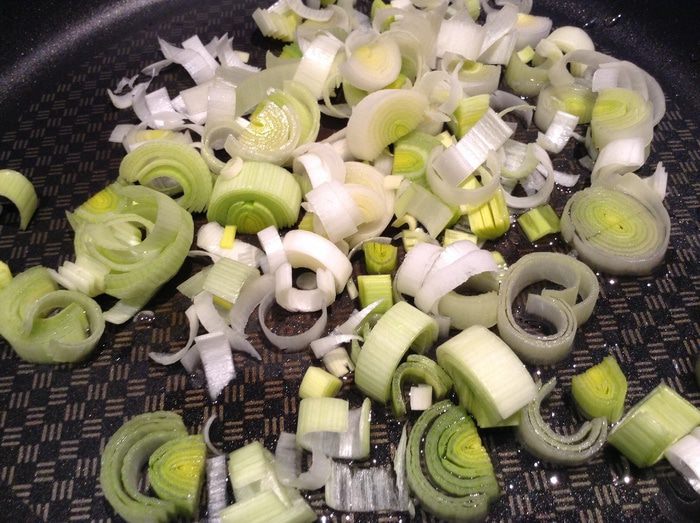 Порей нарезать 1/2 кольцами, обжарить на оливковом масле.