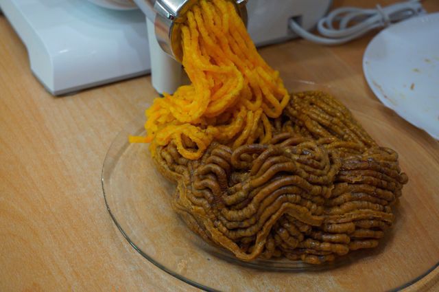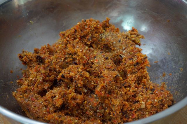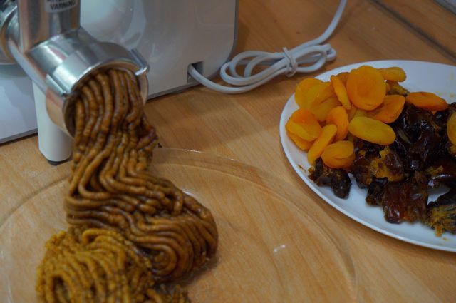 Включаем мясорубку, все перемалываем, начиная с фиников и изюма...