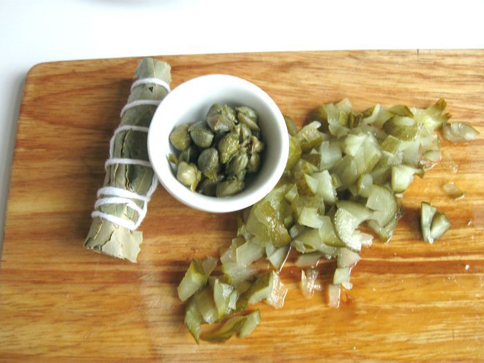 Небольшой крепкий соленый огурец (или корнишоны) мелко порезать. Должна получиться примерно 1 ст. л. порезанных огурцов.