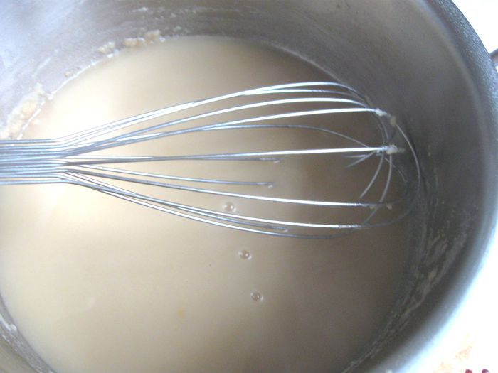 Бульон подогреть, постепенно добавить к муке с маслом. Постоянно перемешивать, добиться однородности жидкости, комков не должно быть.