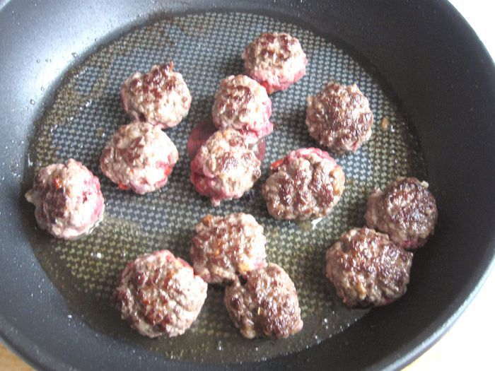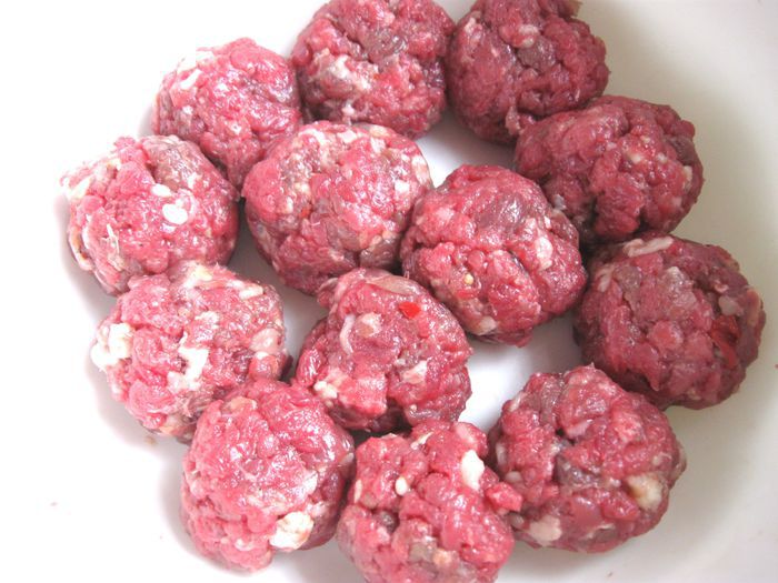 Приготовить фрикадельки. С колбасок снять оболочку. Я решила взять для рецепта говяжьи колбаски, в состав которых наряду с говядиной входил почечный жир, чеснок, лук, перец красный, перец чили, масло растительное.