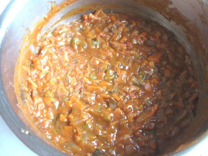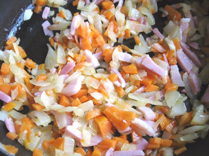 Приготовить соус. Морковь и лук почистить, мелко порезать. Поджарить овощи на оливковом масле на среднем огне на сковороде. Добавить бекон, порезанный полосками, дать немного времени, чтобы овощи и бекон объединились. В книге рекомендуется добавить еще кусочек стебля сельдерея.