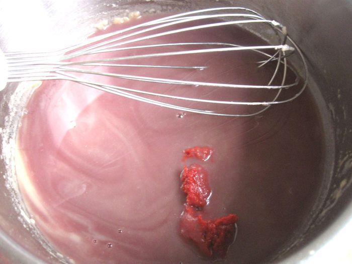 Добавить красное сухое вино, томатную пасту, подержать чуть-чуть на небольшом огне, перемешивая, до полной однородности жидкости.