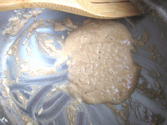 В теплоемкую кастрюлю (сотейник) положить кусочек сливочного масла, поставить кастрюлю на огонь, дать маслу растаять, положить муку, довести ее, постоянно помешивая, до коричневатого цвета.