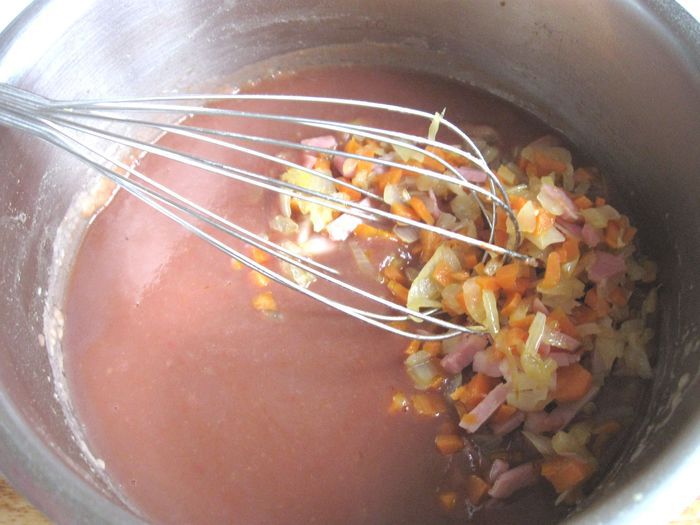 Добавить морковь и лук с беконом, букет гарни и варить при слабом кипении минут 15.