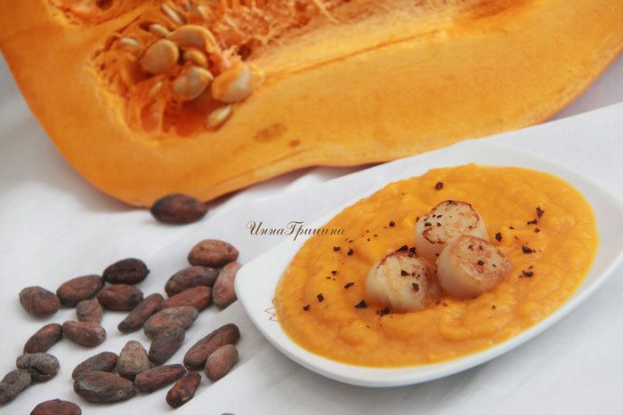 Суп-пюре подавать с гребешками, посыпав измельчёнными какао-бобами (если нет какао-бобов - замените на горький шоколад). Приятного аппетита!