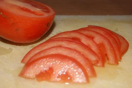Помидоры порезать тонкими дольками.