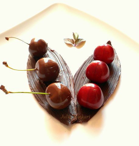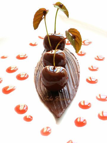 Вишню усаживаем в лодочку, вишневым сиропом делаем на тарелке капли. Листики мяты протыкаем, аккуратно насаживаем на хвостики вишни. Приятного аппетита!!!