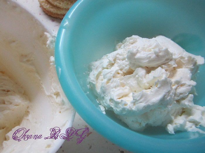 Сливки взбить с 1 ст.л. пудры. Взбить маскарпоне с оставшейся пудрой. В маскарпоне ввести сливки.