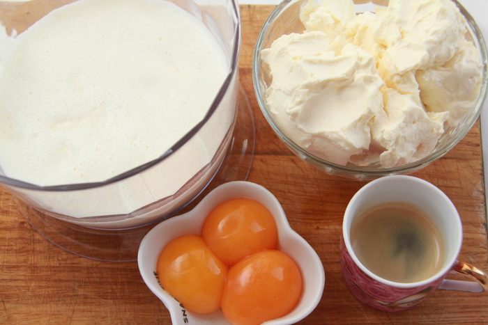 Соединить кокосовые сливки (остывшие), маскарпоне, кофе (сваренный+1 ч.л.растворимого) и желтки. Взбить в крем.