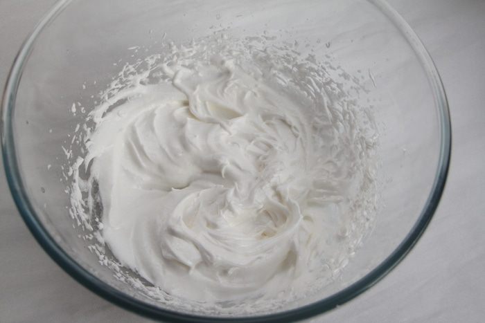 Белки отделить от желтков. Взбить белки до пышной пены, постепенно ввести сахар, взбивать до устойчивой пены.