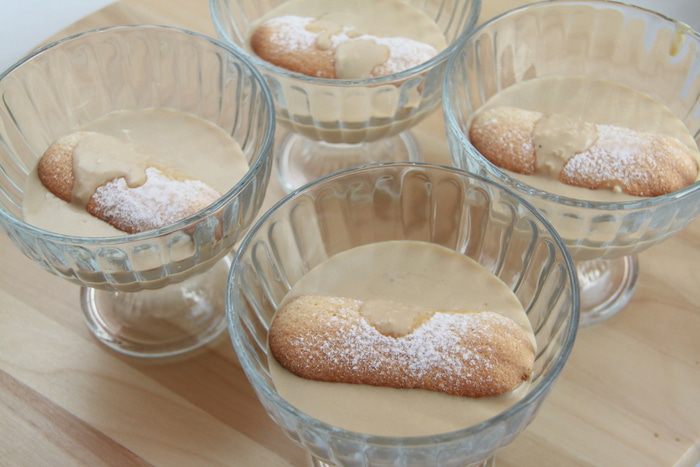 В бокалы положить по одному "дамскому пальчику", налить светлый крем.