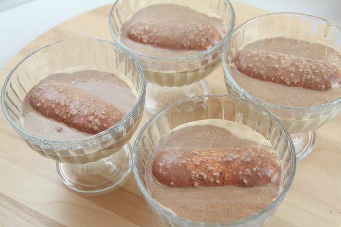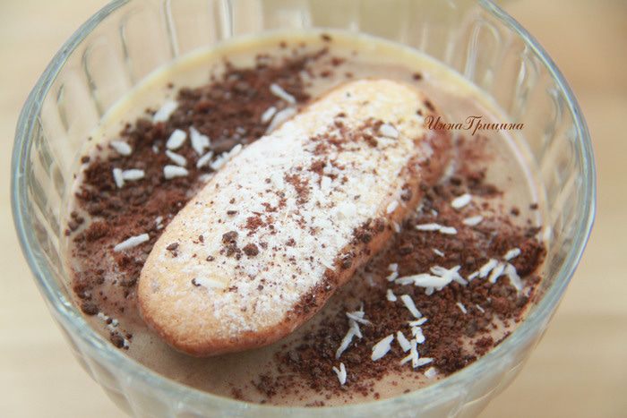 Сверху положить ещё один "дамский пальчик", украсить шоколадной и кокосовой стружкой. Дать десерту настояться в холодильнике пару часов. Наслаждайтесь!