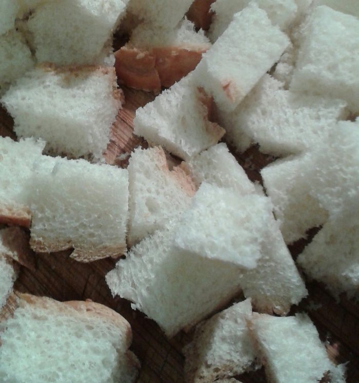 Вчерашний белый батон порезать кубиками. Чеснок мелко порезать, или продавить через пресс. Отправить на 10-12 минут в разогретую до 170 градусов духовку.