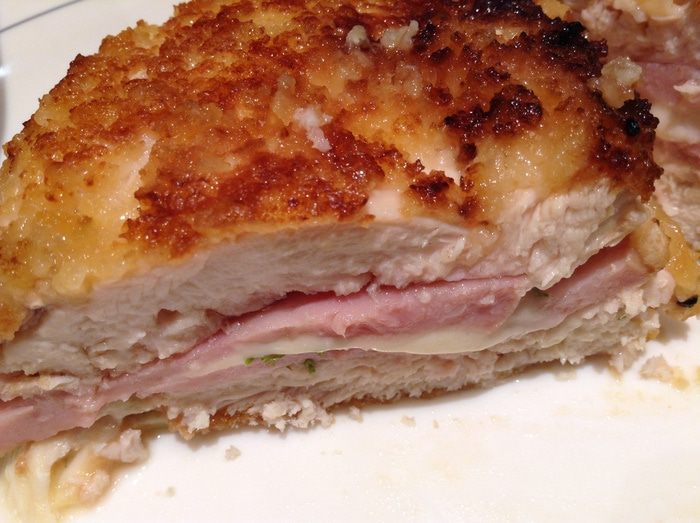 На половинку грудки выложить ветчину, сыр..