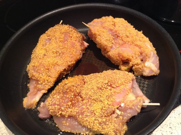 Обвалять в яйце и сухарях.