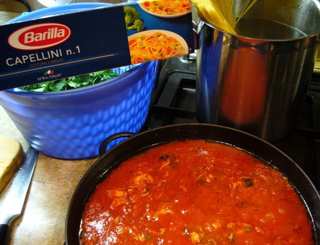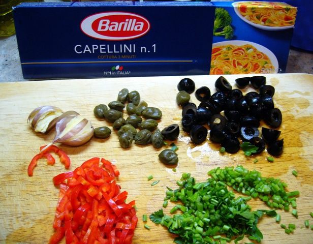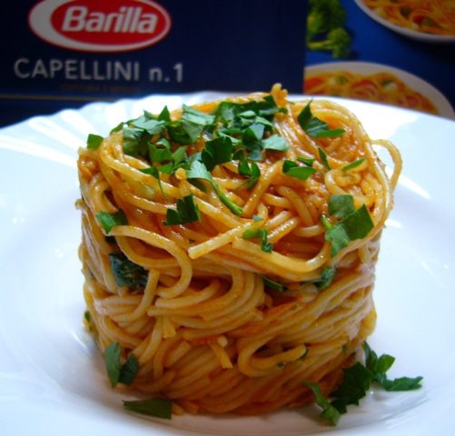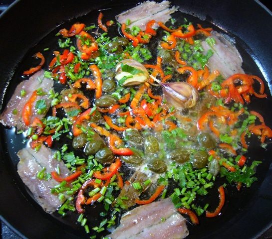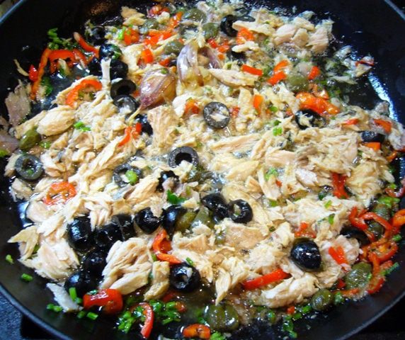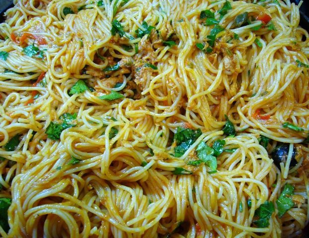 Из сковороды с соусом вынуть чеснок, переложить спагетти в соус. Добавить большую часть петрушки, выжать лимонный сок, сбрызнуть оливковым маслом первого отжима. Хорошо перемешать. Если нужно, добавить воды от варки спагетти (в моем случае не потребовалось).