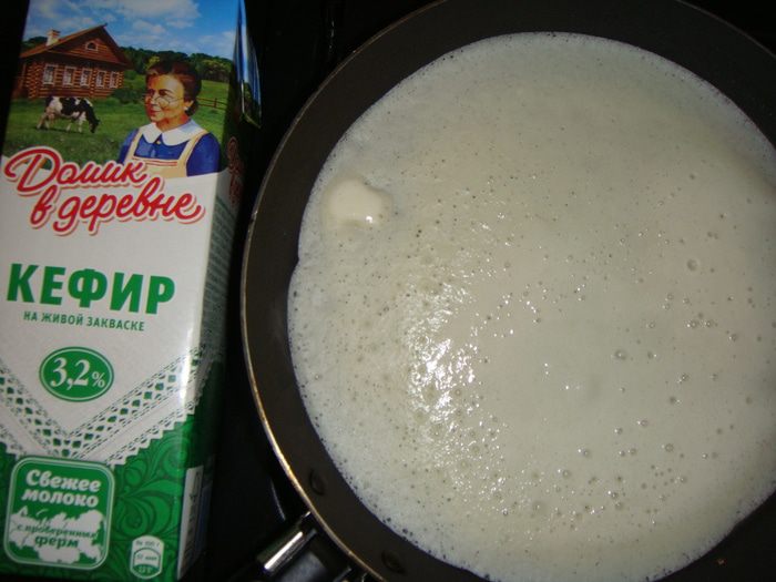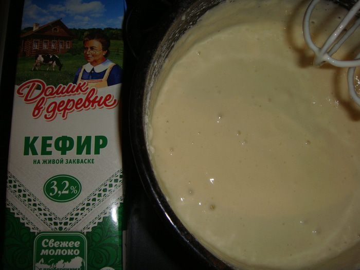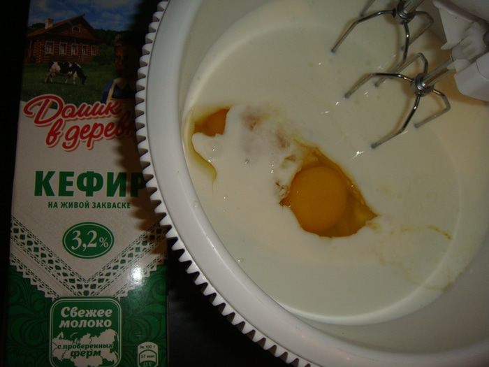 В посуду для взбивания влить кефир «Домик в деревне», добавить яйца, соль и сахар, перемешать.