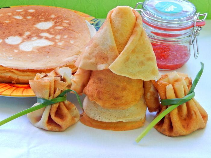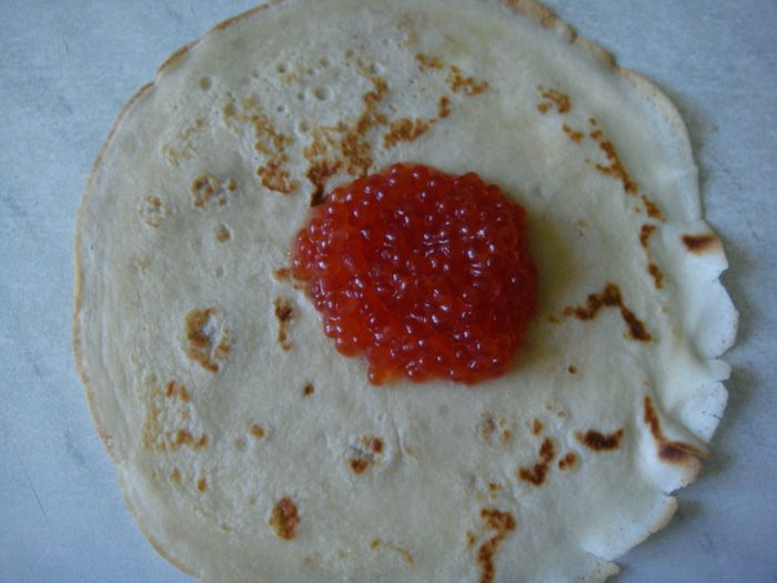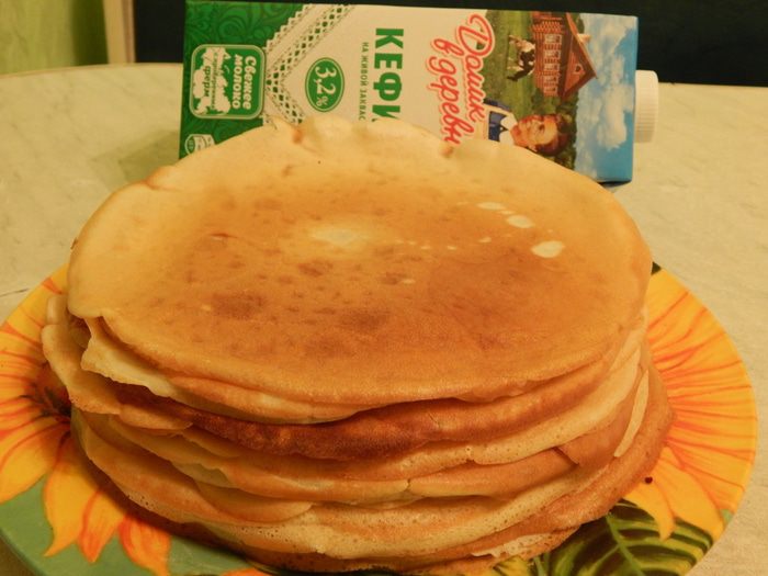 Так начался наш сегодняшний масленичный день. Блинчики на кефире получаются тоненькими, с дырочками, тающими во рту. Их можно подавать как фаршированными, так и со сметаной или ягодным соусом. Из части блинчиков я сделала мешочки с красной икоркой, а другую часть мы ели со сметанкой. Количество ингредиентов можно уменьшить вдвое.
