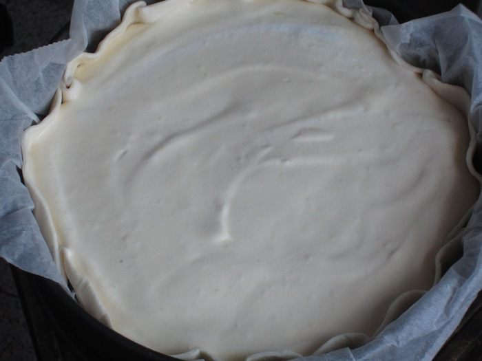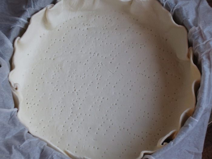 Пекарскую бумагу намочить водой , хорошо отжать и выстелить дно формы диаметром 24 см. Слоёное тесто раскатать в круг диаметром 30 см, выложить в форму и наколоть вилкой.Поставить в холодильник.