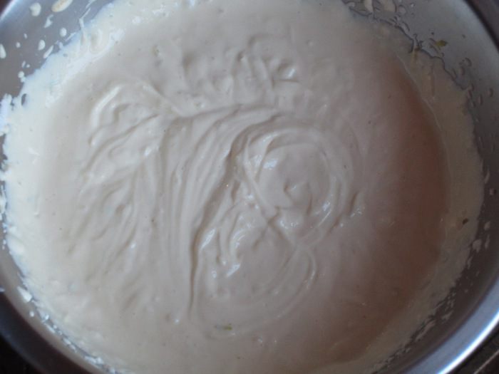 Добавить ванилин,сливки,соль,крахмал и снова взбить миксером на средней скорости до однородности.