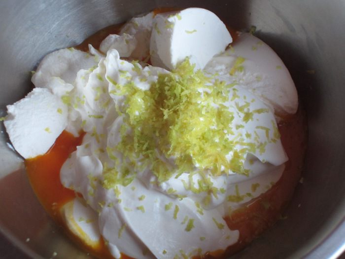 Начинка:Снять цедру с 1 лимона.Соединить рикотту,йогурт,яичные желтки,цедру лимона и взбить миксером на минимальной скорости до получения однородной массы.