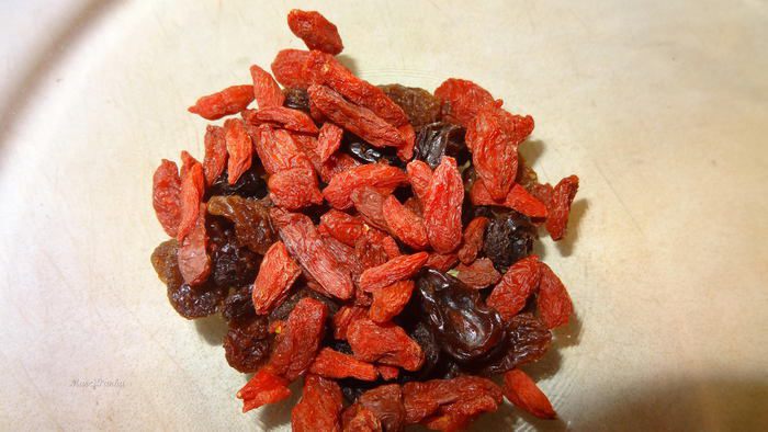 В мисочке перемешать изюм и ягоды годжи.