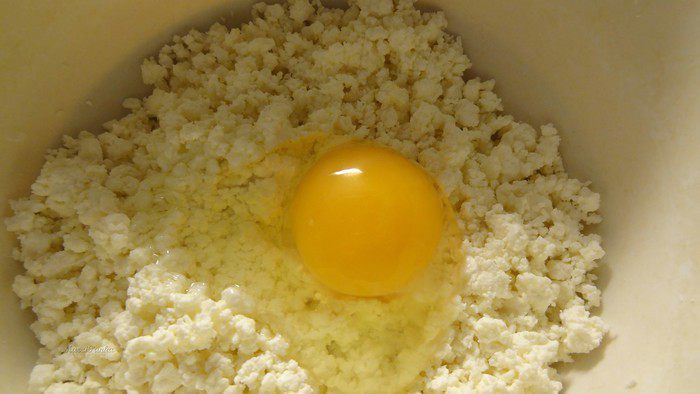 Добавить 1 яйцо в творог.