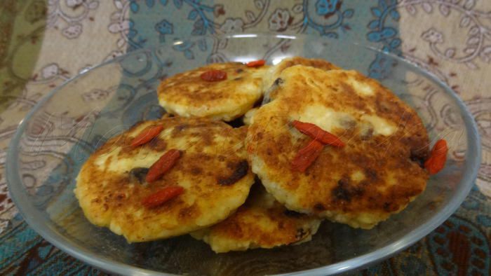Обжарить сырники на растительном масле. Подавать со сметаной, украсить ягодами годжи.
