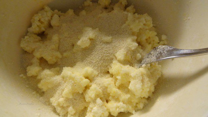 К сырникам добавить соль, сахар, ванильный сахар и манку. Дать постоять 15 минут, чтобы манка вобрала в себя лишнюю жидкость от сырников.