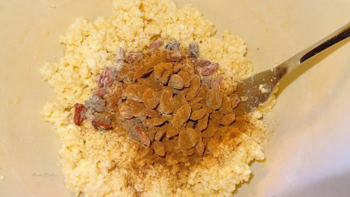 Добавить изюм и ягоды годжи в тесто для сырников, а также корицу.